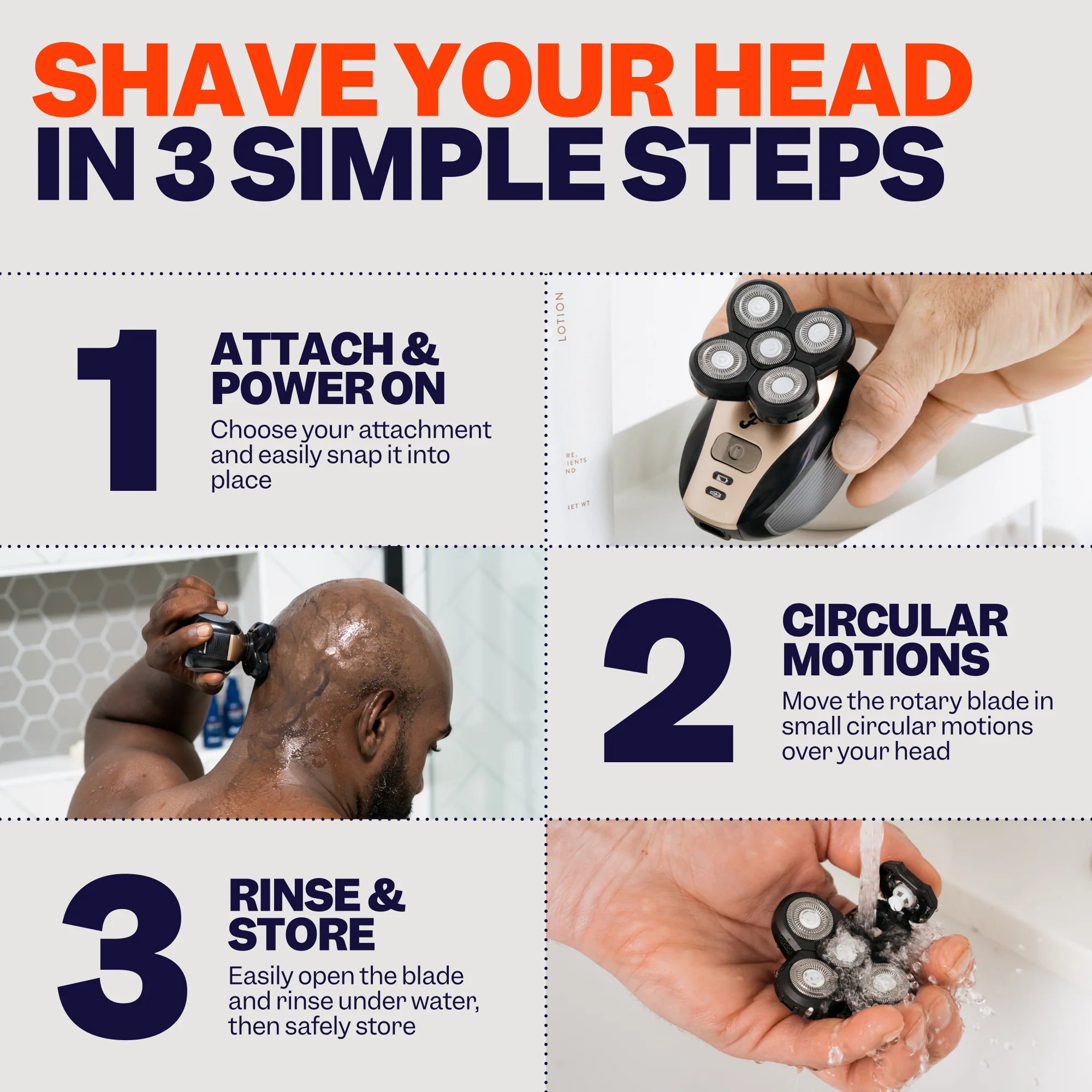 Charge Your Shaver: Ensure your FlexSeries Electric Shaver is fully charged. Prep Your Skin: Apply Lubricating Pre Shave Oil to soften hairs. Wash your face and scalp with warm water. Select Your Attachment: Attach the ScalpSafe Rotary Blade for a close shave, or use the Precision Clipper for trimming. Shave: Perform small, circular motions across your scalp and face. For trimming, guide the Precision Clipper smoothly. Enhance Your Shave: Apply Soothing Shave Gel for an even smoother experience. Rinse & Dry: Cool water rinse post-shave, then pat dry. Clean Your Shaver: Rinse the attachments under water to remove hair and debris. Post-Shave Care: Moisturize with Hydrating Post Shave Lotion to soothe your skin. Maintenance: Keep your shaver charged and blades fresh for next time.