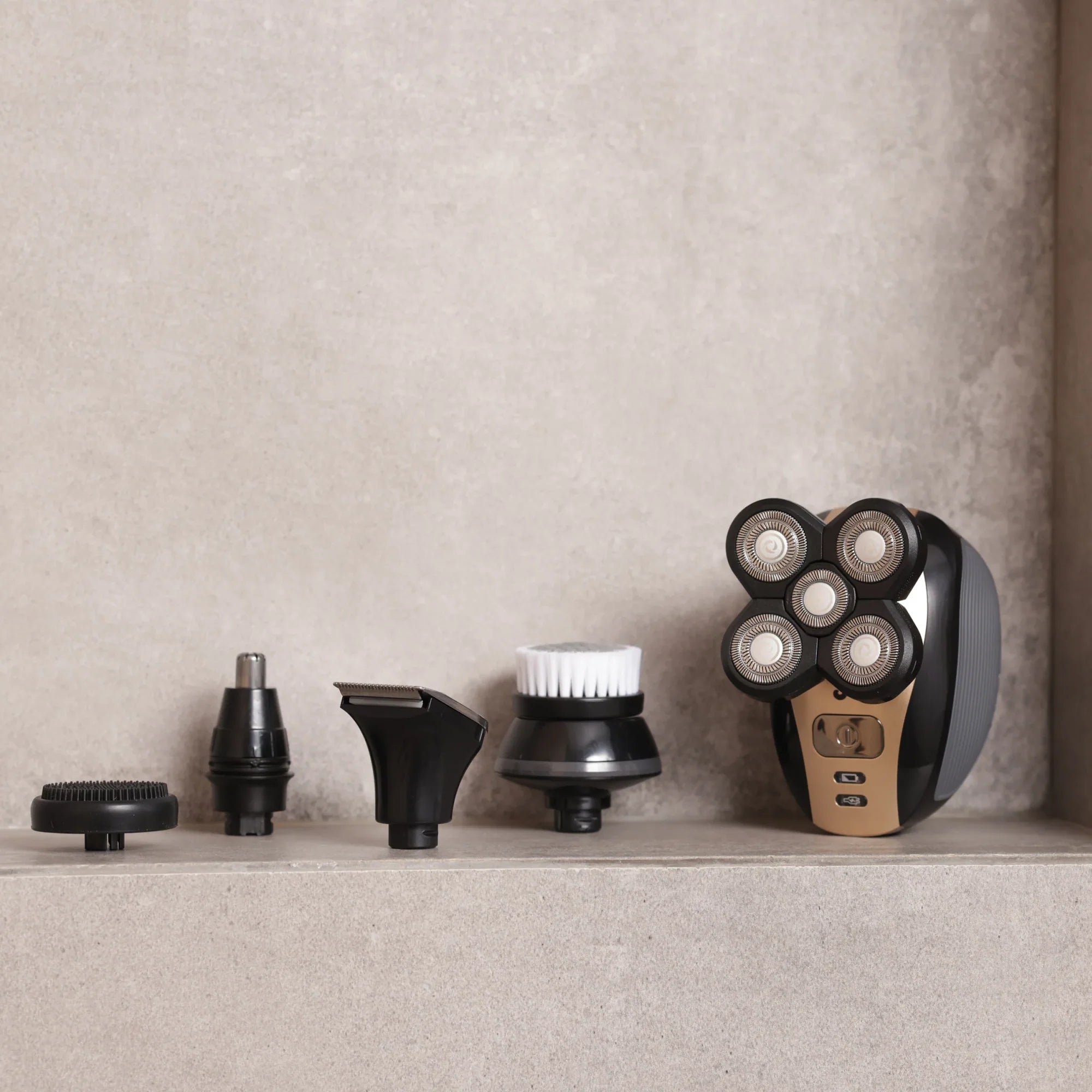 - FlexSeries Electric Shaver - ScalpSafe Rotary Blade Attachment - USB Charging Cable - Precision Clipper Attachment - Nose & Ear Trimmer Attachment - Exfoliation Brush Attachment - Scalp Scrubber Attachment - Micro Cleaning Brush