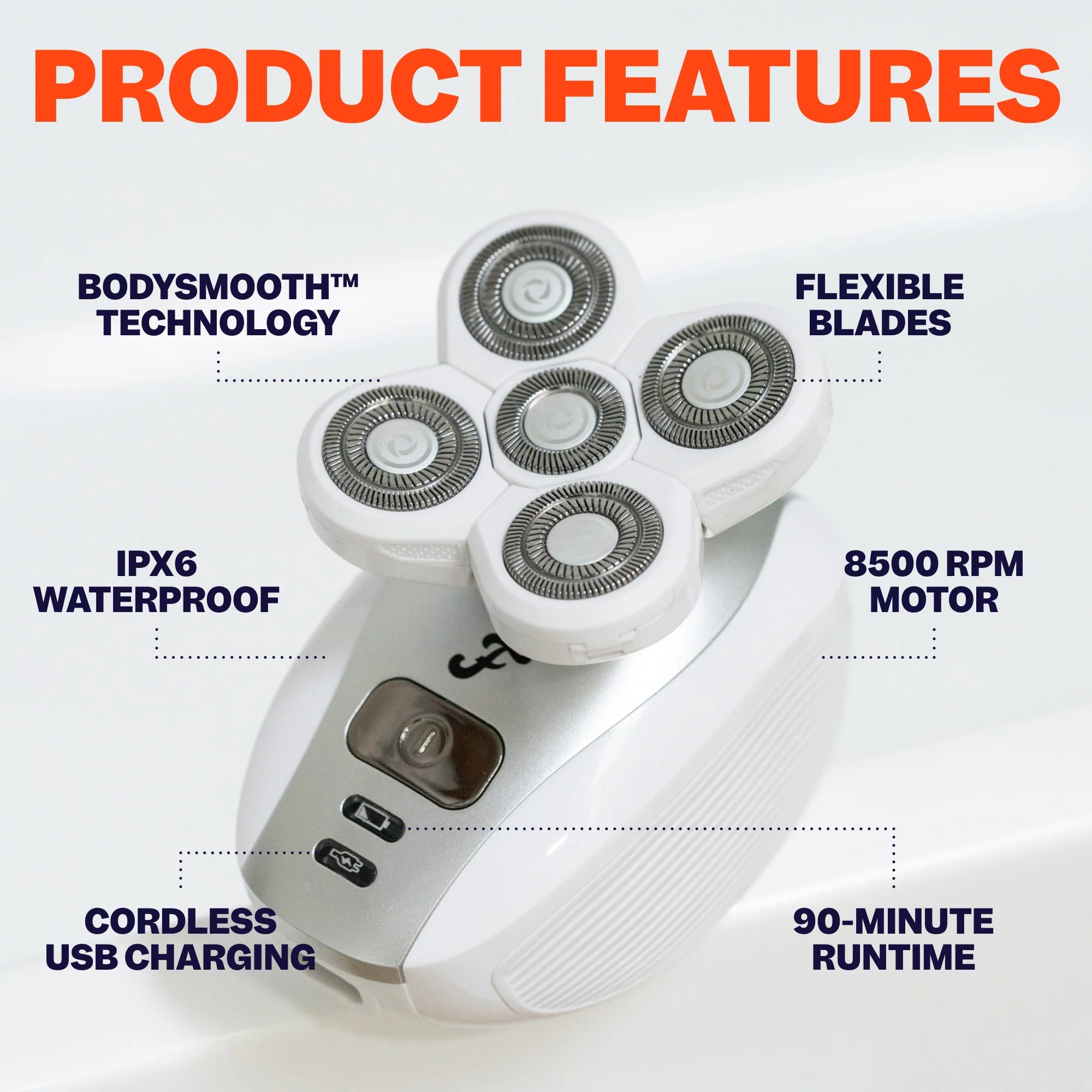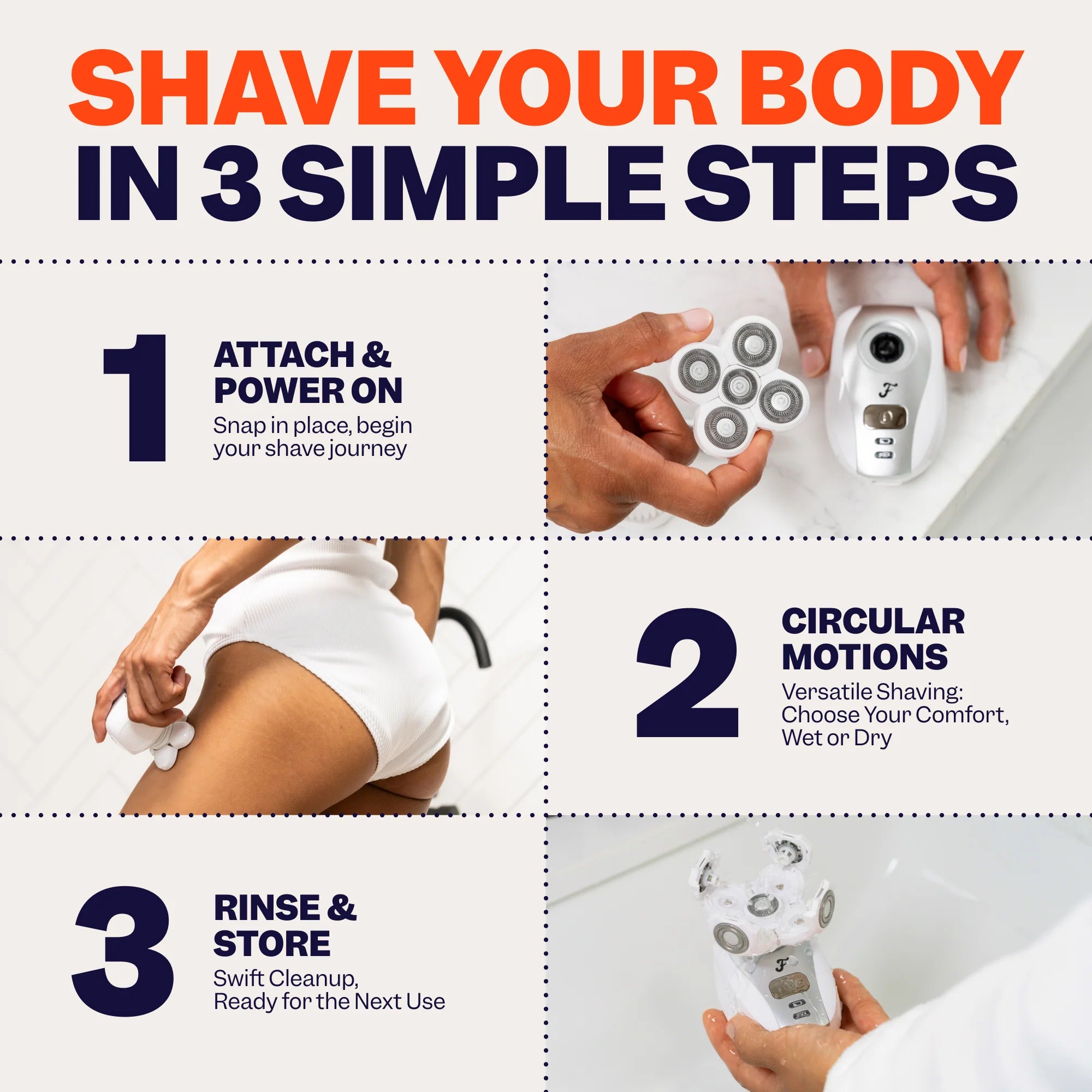 Silky-Smooth in 90 Seconds: Achieve soft, touchable skin in under two minutes—no razor, no fuss. Safe for Sensitive Skin: No more nicks, cuts, or razor burn—just gentle, irritation-free shaving. Close & Comfortable: Get that razor-smooth finish with our BodySmooth™ Rotary Blades—without the hassle of traditional razors. Shave Your Way: Use it wet, dry, or in the shower. Wherever and whenever you want to feel confident, it’s ready. Effortless Control: The lightweight, ergonomic design is easy to hold and helps you reach every curve with precision. No Mess, No Stress: Say goodbye to clogged razors and messy cleanup. This shaver keeps things neat and simple. All-in-One Self-Care: Includes attachments to exfoliate, trim, and shave—everything you need for full-body grooming. Affordable Luxury: Skip the pricey salon visits and disposable razors. Get premium performance at a fraction of the cost.